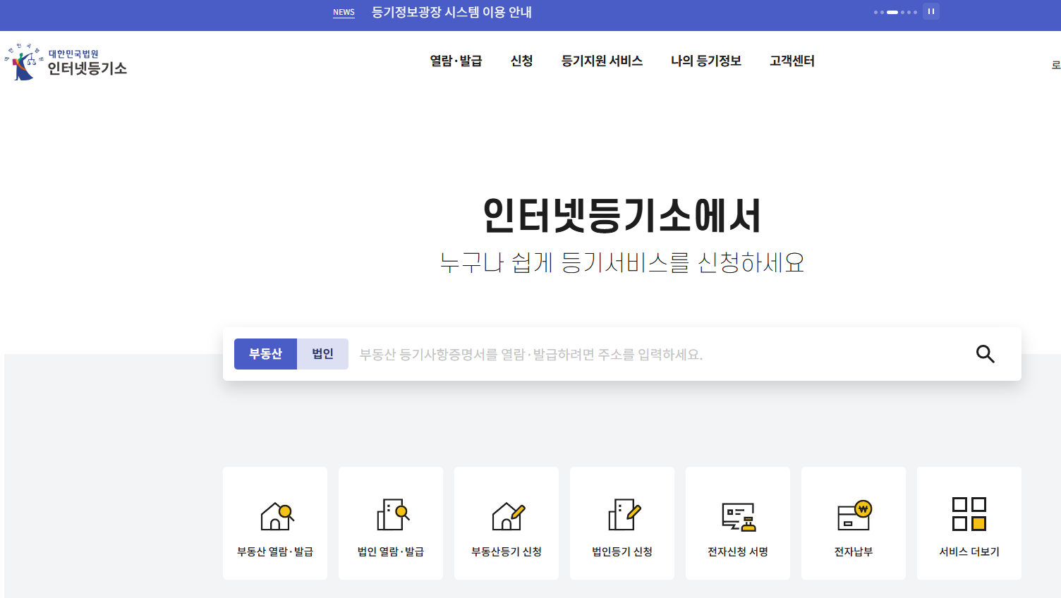 - 대법원 인터넷등기소 접속: 대법원 인터넷등기소 웹사이트에 접속합니다.