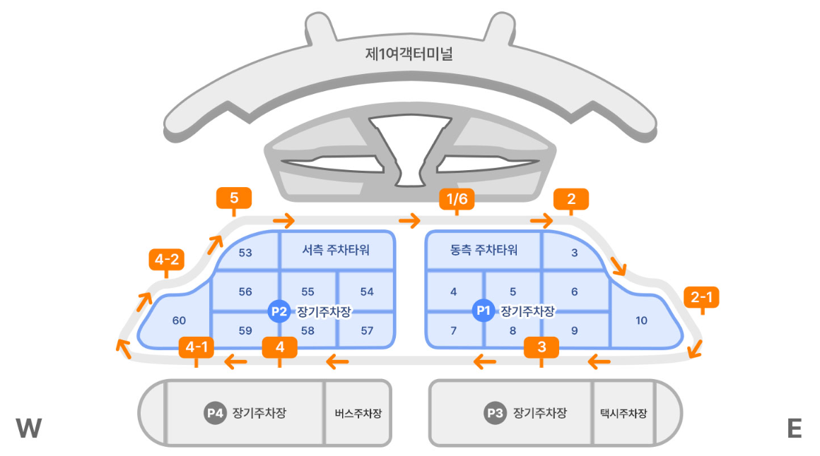 - 위치: 터미널에서 조금 떨어진 곳에 위치해 있습니다. 무료 셔틀버스가 수시로 운행됩니다. (제1여객터미널 장기 주차장, 제2여객터미널 장기 주차장, 장기 주차 타워 등)