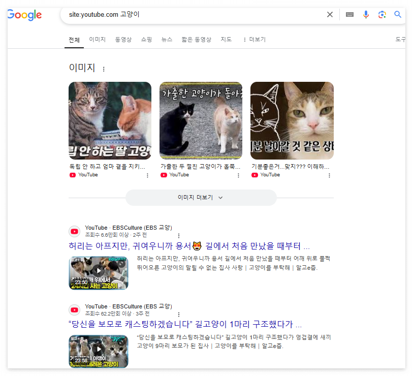 - site:사이트주소 검색어 를 이용하여 특정 사이트에서만 검색이 가능합니다. 예시로 site:youtube.com 고양이 를 검색하면 유튜브 사이트 안에서 고양이가 검색이 됩니다.