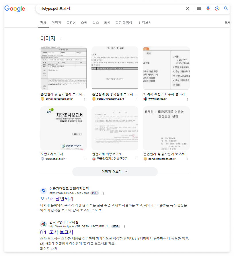 - filetype: 특정 파일 형식의 결과를 찾을 때 사용합니다. 'filetype:pdf 보고서'처럼 검색하면 PDF 형식의 보고서 파일을 보여줍니다.