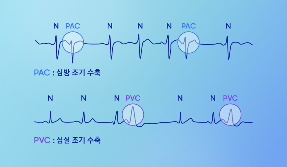 ▲PAC(심방 조기 수축)와 PVC(심실 조기 수축) 등의 이소성 박동 감지