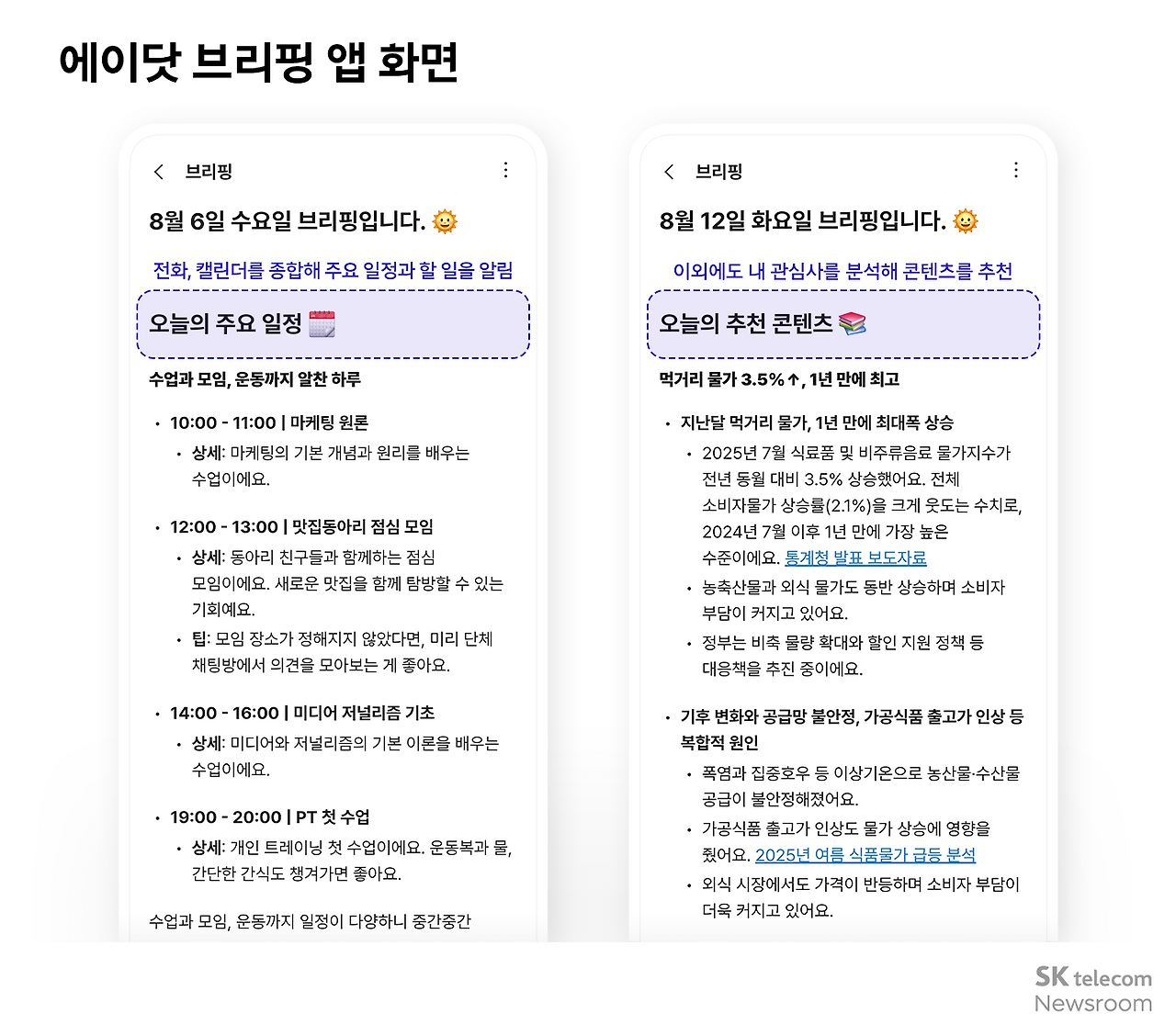 에이닷 노트 외에 대학생이 일상에서 활용하기 좋은 기능으로 ‘에이닷 브리핑’도 추천한다. 에이닷 브리핑은 사용자의 일상을 종합적으로 분석해 자연스럽게 정보를 제공하는 개인 비서 역할을 하는 서비스다. 매일 아침 8시, 캘린더와 전화 정보를 종합해 주요 일정과 할 일을 알려주고, 일정에 따른 동선별 날씨나 관심사 기반의 콘텐츠를 추천해 준다. 예를 들어 ‘맛집동아리 점심 모임’ 일정이 있으면, 상세 정보를 알려주고, 모임 장소가 정해지지 않았다면 단체 채팅방에서 의견을 모아보라고 팁을 일러준다. 강의, 약속 등 챙겨야 할 일정이 많은 대학생들에게 유용하다. 에이닷 브리핑은 2만 명 대상으로 베타 서비스 모집 완료되었으며, 고객 피드백을 지속적으로 받으며 개선하고 있다.