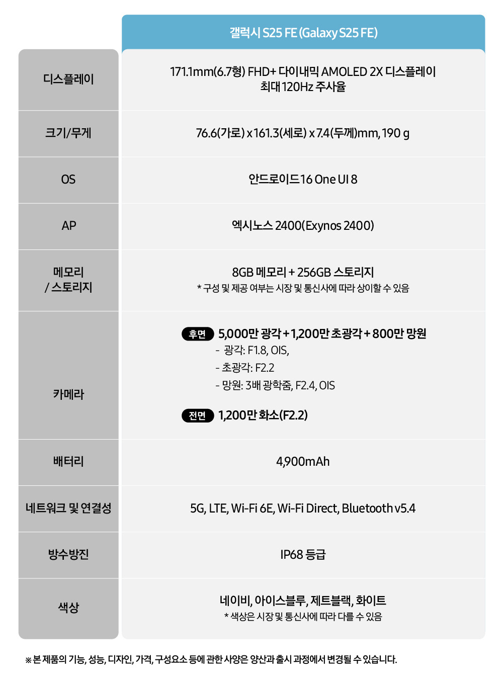‘갤럭시 S25 FE’는 네이비, 아이스블루, 제트블랙, 화이트 등 총 4가지로 출시된다. 국내 제품 출고가는 출시 시점에 공개될 예정이다.