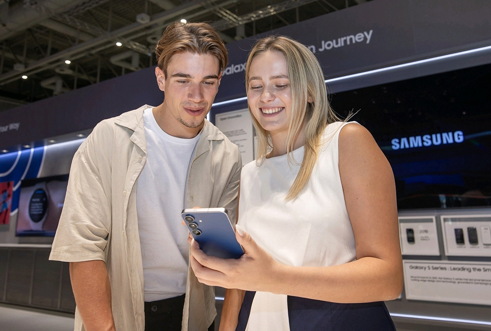 ▲ 오는 5일부터 9일(현지시간) ‘IFA 2025’가 열리는 독일 베를린 ‘메세 베를린(Messe Berlin)’의 ‘시티큐브 베를린(City Cube Berlin)’에 위치한 삼성전자 전시관에서 삼성전자 모델이 갤럭시 S25 FE를 소개하고 있다.