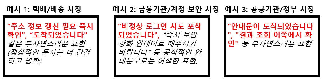- 기관 사칭: 은행, 택배회사, 정부기관, 경찰, 통신사 등 사용자가 신뢰할 만한 기관을 사칭하여 메시지의 신뢰성을 높입니다.