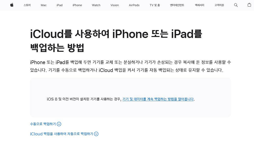- **백업되는 데이터:** 구입한 항목 기록, 사진 및 비디오(iCloud 사진 보관함이 켜져 있는 경우 사진 보관함은 별도로 백업됨), 기기 설정, 홈 화면 및 앱 구성, iMessage, SMS, MMS 메시지, 벨소리, 건강 앱 데이터, Apple Watch 백업 등.